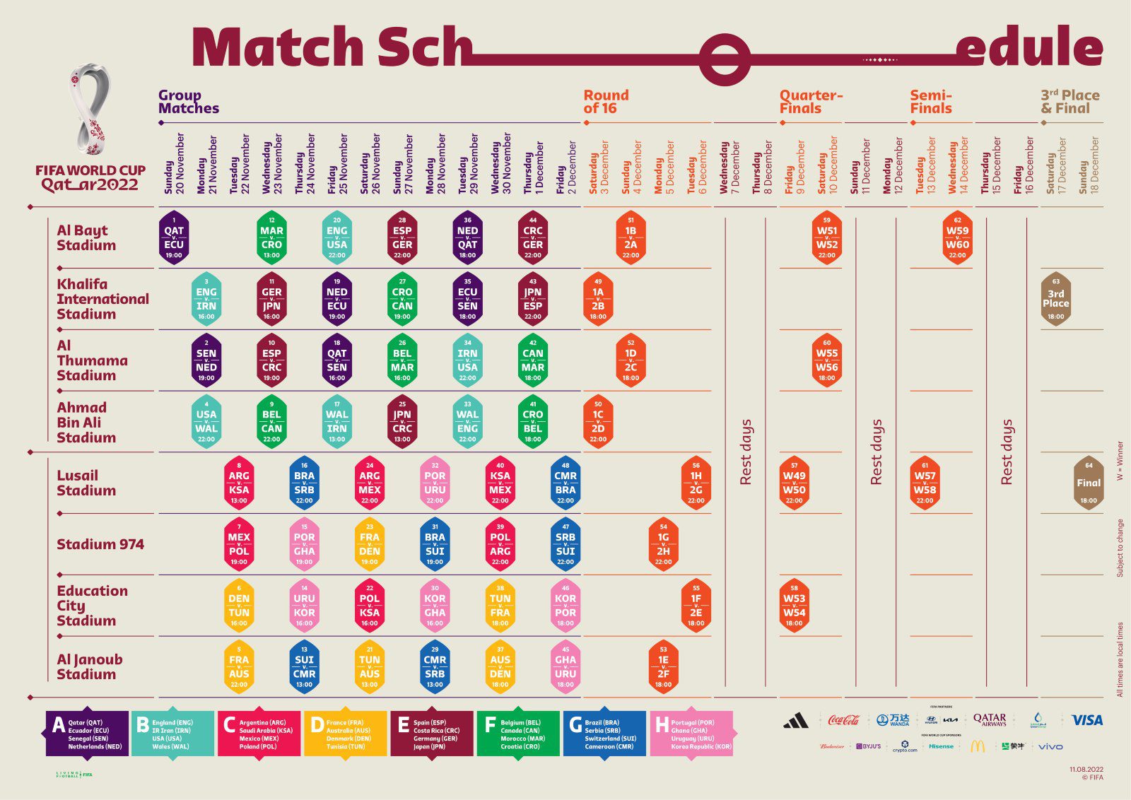 Zie hier het complete speelschema voor het FIFA Worldcup 2022 in Qatar. De vermelde tijden zijn de lokale tijd in Qatar.